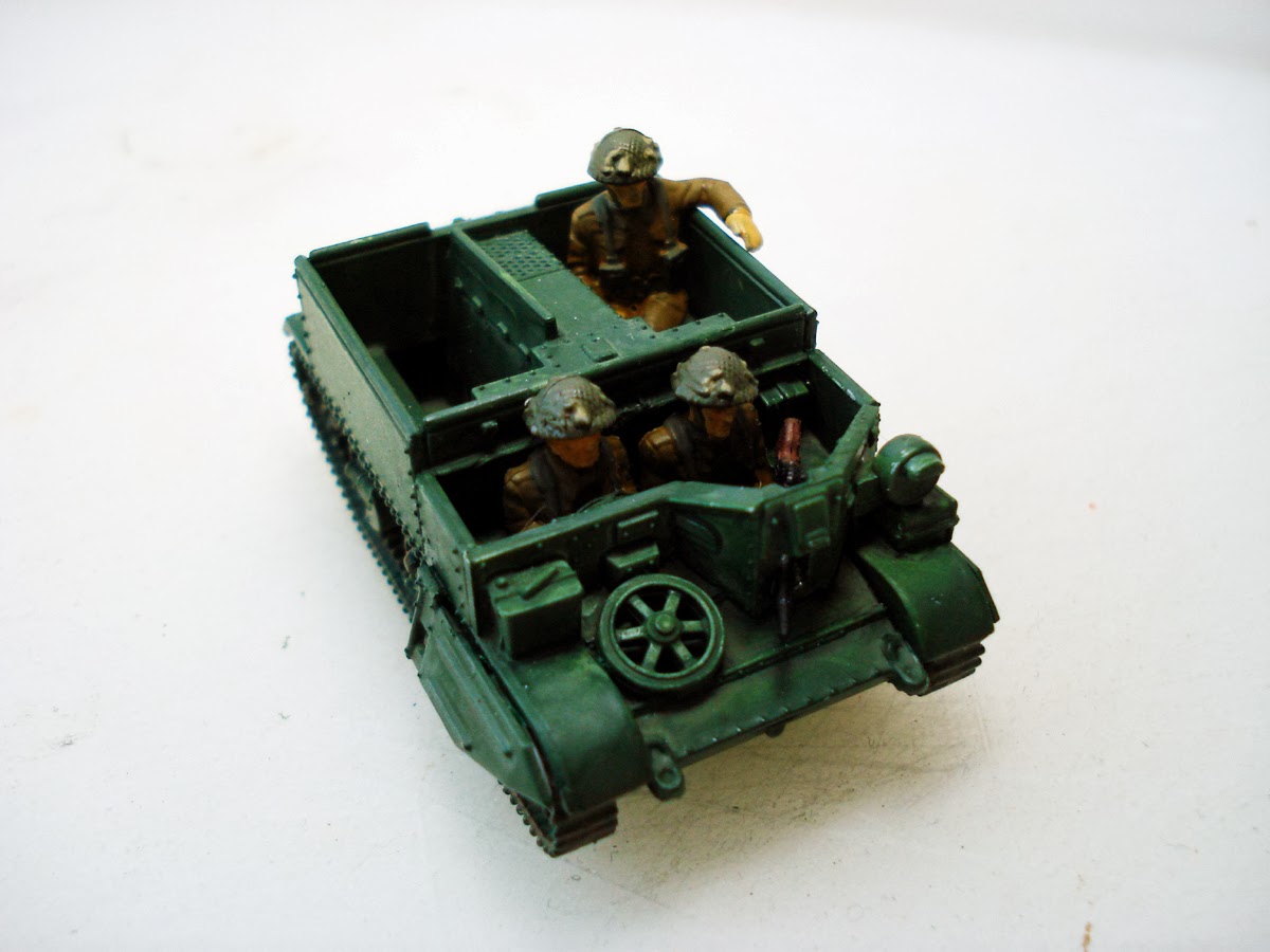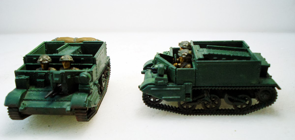 Slowly wrapping up my British platoon for Bolt Action I picked up a set of British Universal Carriers from Plastic Soldier Company. This is a nice model kit with 3 sprues for Mk 1 and Mk 2 carriers. Each includes 2 crew members, Bren LMGs, and a pair of passenger models. The kit for the most part assembles pretty easily. The one downside was the crew members.