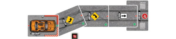 Players resolve their turn one at a time, using a special maneuver deck. Players program the movement for their turn and then flip through the cards one at a time on their turn to move. It’s a rather simple, elegant system over relying on movement using a measuring tape. As each card is turned over, some may require maneuver tests. If successful the car continues, otherwise some mishap could happen.