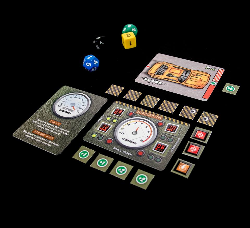 The game uses a clever system of assigning die types to various car characteristics to represent engine power, defense, driver skill, and weaponry. Players distribute a single D6-D12 for each of the car attributes with a higher die type translating into a more effective stat. Each car type also has base stat bonuses which add to the die type value, allowing players to rely on base car characteristics plus a lower assigned die type if seeking to tweak out a different attribute more.