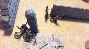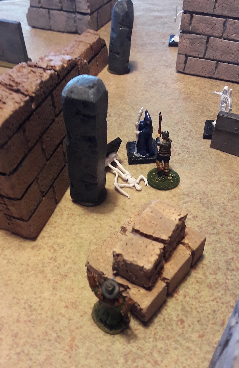 My opponent was able to easily secure treasure from columns on his side of the table. Casting Fleet Feet, his soldiers hurried forth and his trackers got up to some high ground to cause havok. I had my thug try to cut down the 2 wild dogs. One was killed but later during the turn the other tore him to pieces. I had my apprentice back up and cast Blinding Light on the remaining dog while my archer shot at the skeleton.