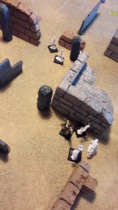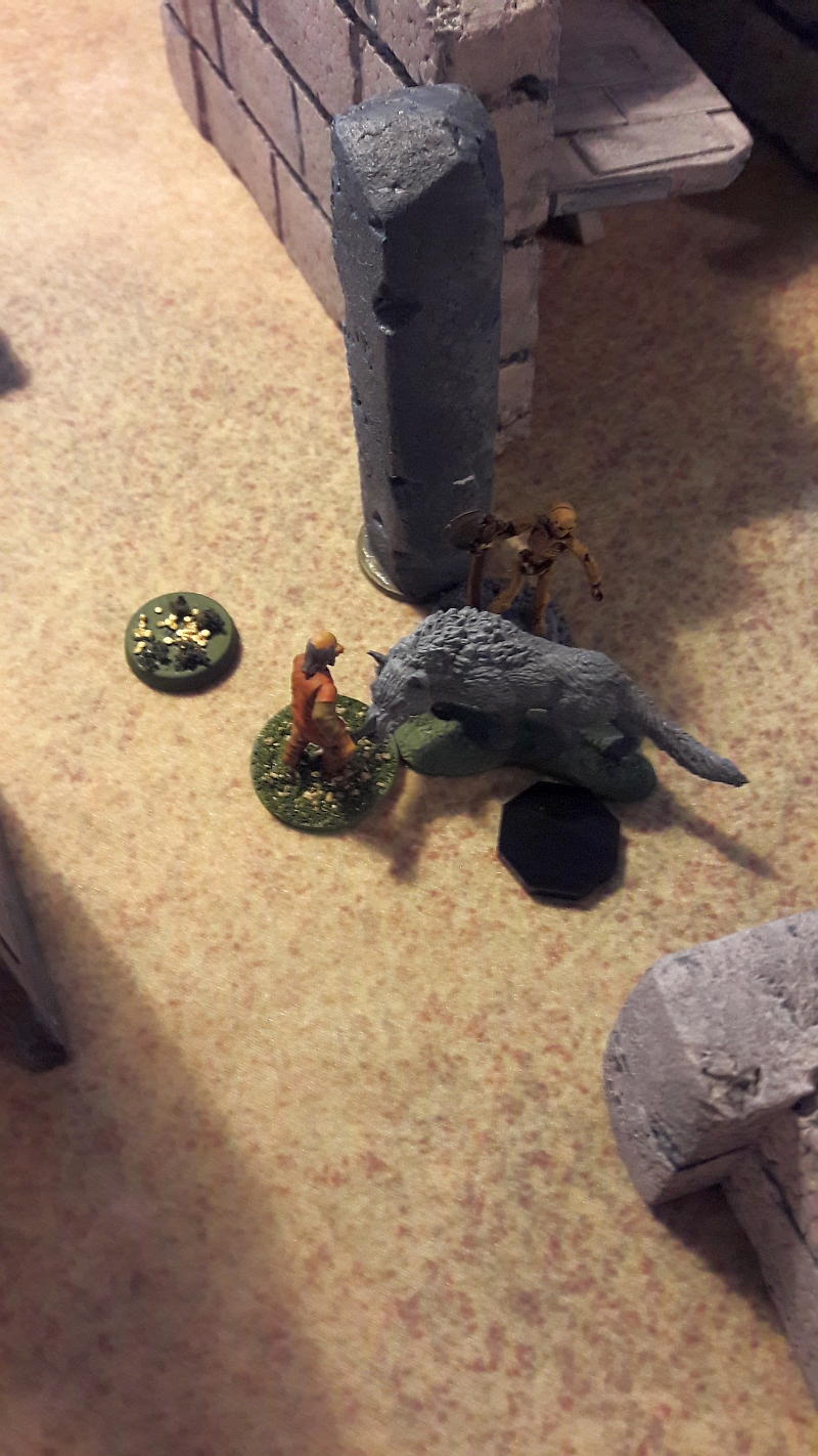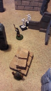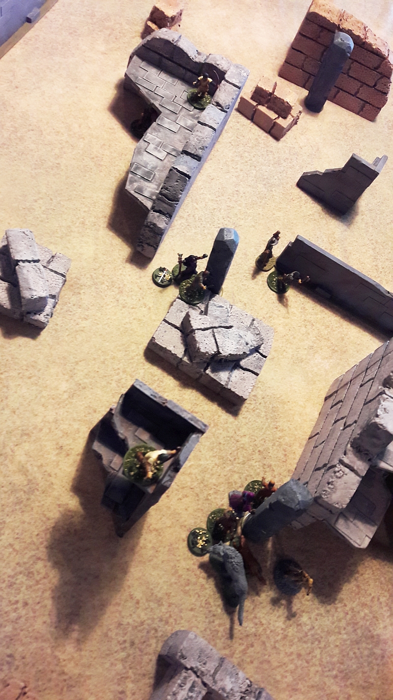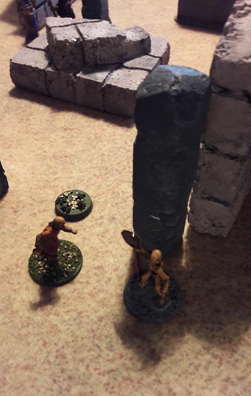 With my wizard out of sight behind a wall, Wanda was able to drop the treasure and prepare to enter the fray, as my thief lugged the prize off the table. Meanwhile my opponent got his necromancer to smash a column and begin dragging away a pile of treasure. Casting a deft Leap, his other men began to scramble back to his base burdened by the loads of coin they found. All the while the necromancer hurried to a pile of rubble to cover his warband.