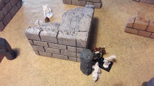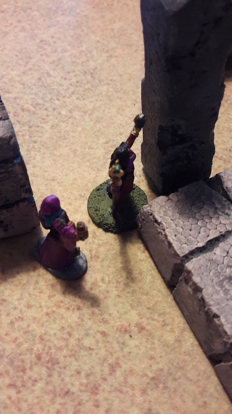Quite honestly, this was another game I got wrapped up in and didn’t bother with proper notes or a lot of pics. The first turn I moved up my wizard with a thief in tow to snatch treasure from a nearby column. My wizard was lucky to win a round of combat and gained the treasure, but was saddled down trying to haul it out of line of sight. My crafty opponent lined his wizard up to keep me in his LOS. If I dropped the treasure and lost initiative, I was certain he’d cast Telekinesis to drag my booty just out of reach from my wizard and thief.