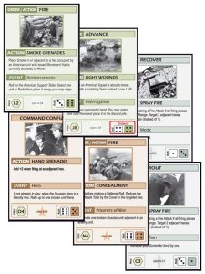 After playing a specified number of cards, players may discard additional cards and then draw up to their maximum hand size, ending their turn. Individual cards have 4 simultaneous functions associated with them. They represent orders given during your turn and also as actions which can be played during either players’ turn. Cards also represent random events, and can serve as die results too. Every card has the results from two six-sided dice, and each deck represents roughly twice the entire possible outcomes of rolling 2 dice (ex. there is a 1 in 36 chance of rolling two ones, so in the deck at most you’ll have two double 1 dice results). This allows a player to figure out dice probabilities up to a point.