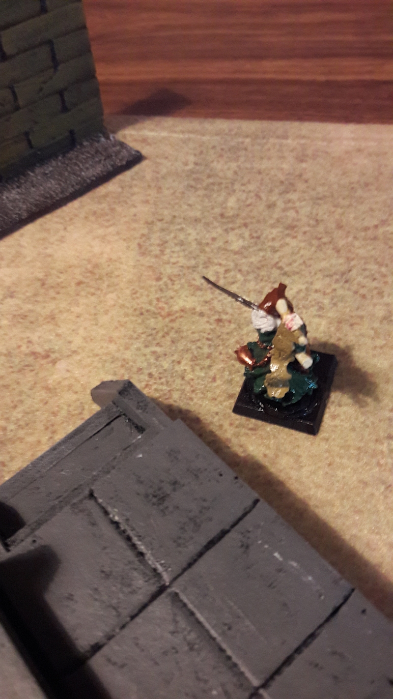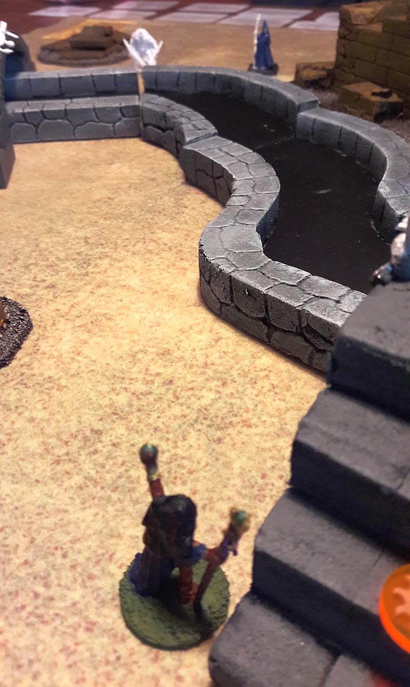 I was facing a necromancer that had a pretty tough warband. We both got off our out of game spells allowing me to add an additional treasure using Reveal Secrets and my opponent getting a zombie to add to his warband strength. Despite the normal scenario, we decided to go all out with the terrain and add an unusual feature. The entire map would be bisected with a deep stream that was uncrossable save using a few key bridges. Fortunately the span of the stream was just long enough to jump at a full 6” sprint.