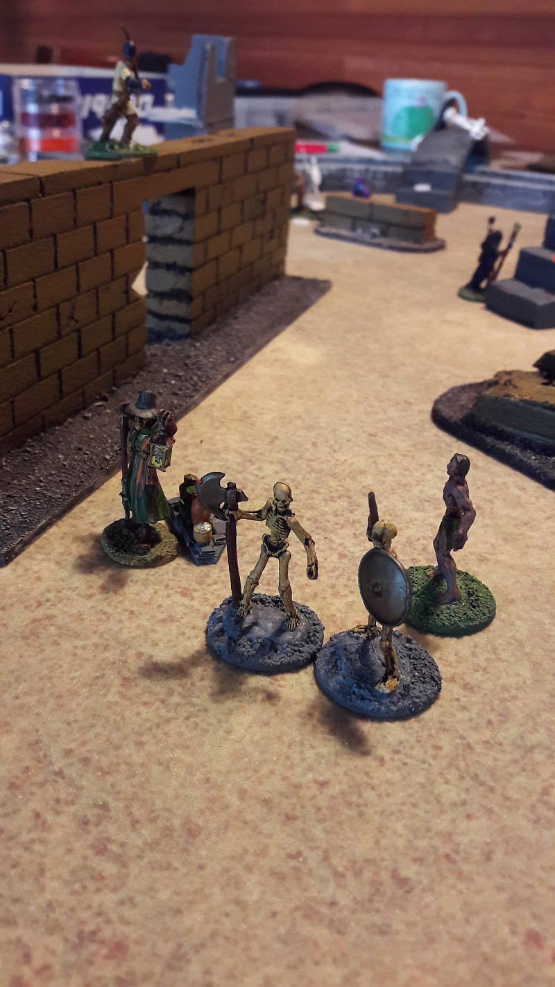 Fortunately a bit of luck came my way and I was able to snatch the initiative for a round. I skirted my wizard around to get his zombie soldier in sight and used my scroll of Control Undead. The shambling follower lagged behind so my opponent had used it as a bodyguard for his apprentice. Now it became a follower for my warband! It harassed his apprentice, getting into a round or two of combat. His apprentice would manage to win rounds but not hit high enough to inflict damage. So he’d push off and then spend most of the next turn moving trying to keep his distance. At this point in the campaign, losing an apprentice would have been a disaster.