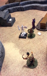 The undead to my left kept pursuing my treasure hunter. However he was able to use his superior movement rate and had just enough distance to get away. My archer positioned himself to be closer to the creatures and on the following turn they clambered up a ruin wall to go after him instead. This allowed my treasure hunter to sneak off with some loot.