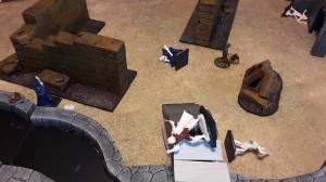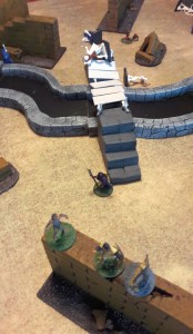 My opponent was flinging bone darts left and right which kept my spell casters trying to hide behind cover much of the initial part of the game. Both my opponent and myself got initial enemies flung far forward on the table using Leap and Push, respectively. I was able to get my barbarian forward on the right bridge, while my opponent got his infantrymen across the bridge to my left.