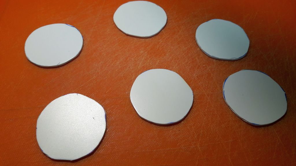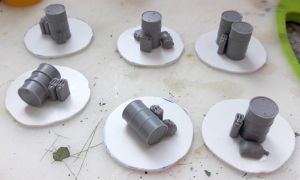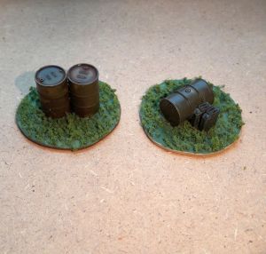 I traced out circles on plasticard and cut them out with scissors. Using some sandpaper, I buffed the rough edges to even them out some. Being plasticard, I could use model cement to glue oil drums and fuel cans directly to the card.
