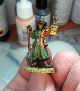 Another type of highlight which can add a fun look to your mini is Object Source Lighting (OSL). This is adding highlights of stark contrast colors to mimic light emitting from a source on the mini. Blending is pretty much a must here. Pick a part on the figure that you picture emitting light, then add the lightest color to that area. Raised edges and other areas on the figure that you think would catch that light source will have darker shades of that same color. Avoiding deep recesses, you want to pick out the edges that would collect the imagined light and use a darker tint compared to the one used for your ‘source’ of light. In the undertaker figure below, you can see how this high contrast highlight is used to create an OSL-like effect from the lantern.