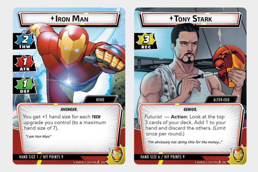 Each hero persona has an alter ego form. In the non-hero form the player commonly has a larger hand size and can heal damage taken by the villain. While in hero form the player can be more proactive taking on the villain or stopping their plans, but can potentially leave themselves open to being attacked. In addition to this, in hero form the player will also have a limited hand size. So usually they need to have a pretty solid board state with cards in play to provide resources or allies to help take the fight to the villain.