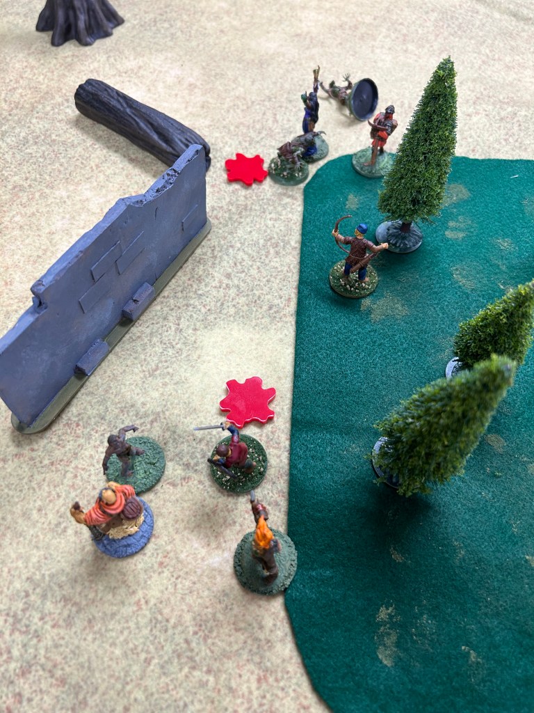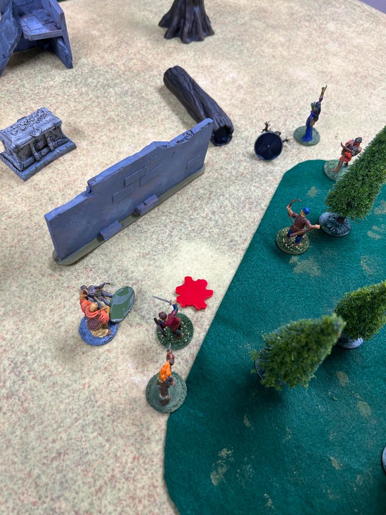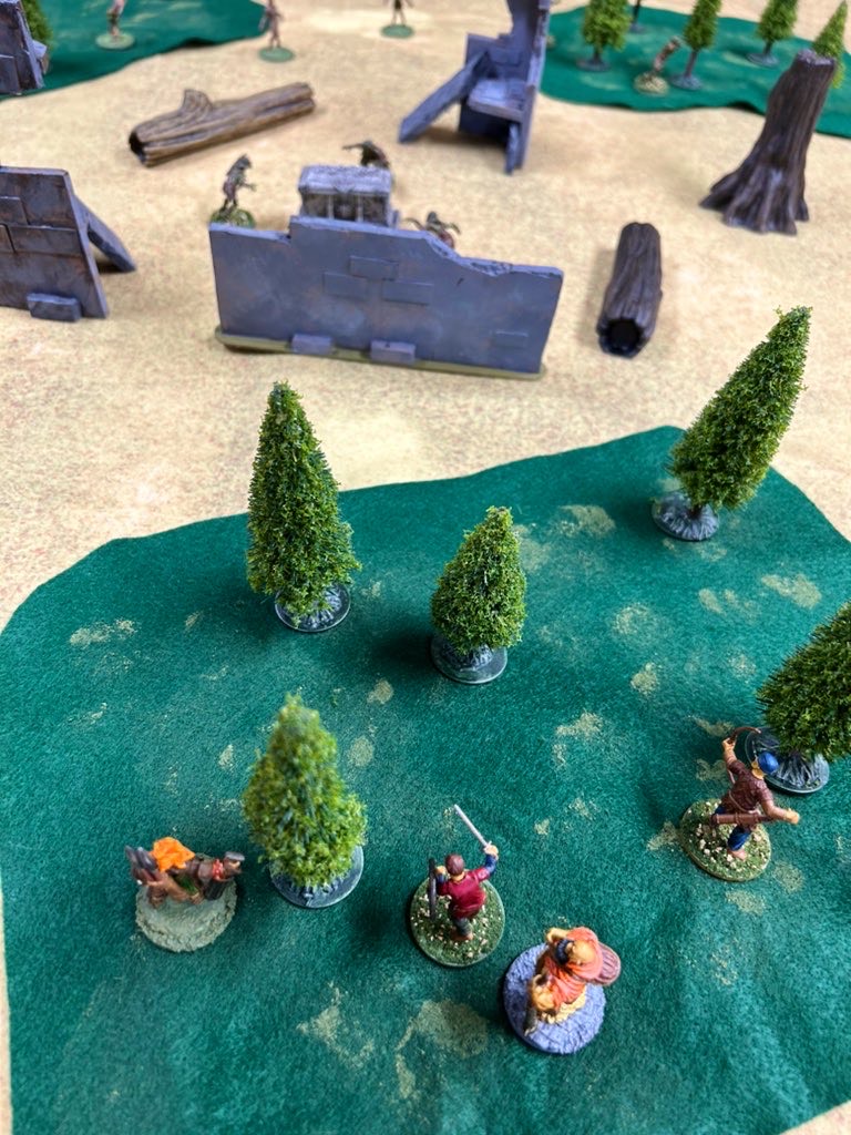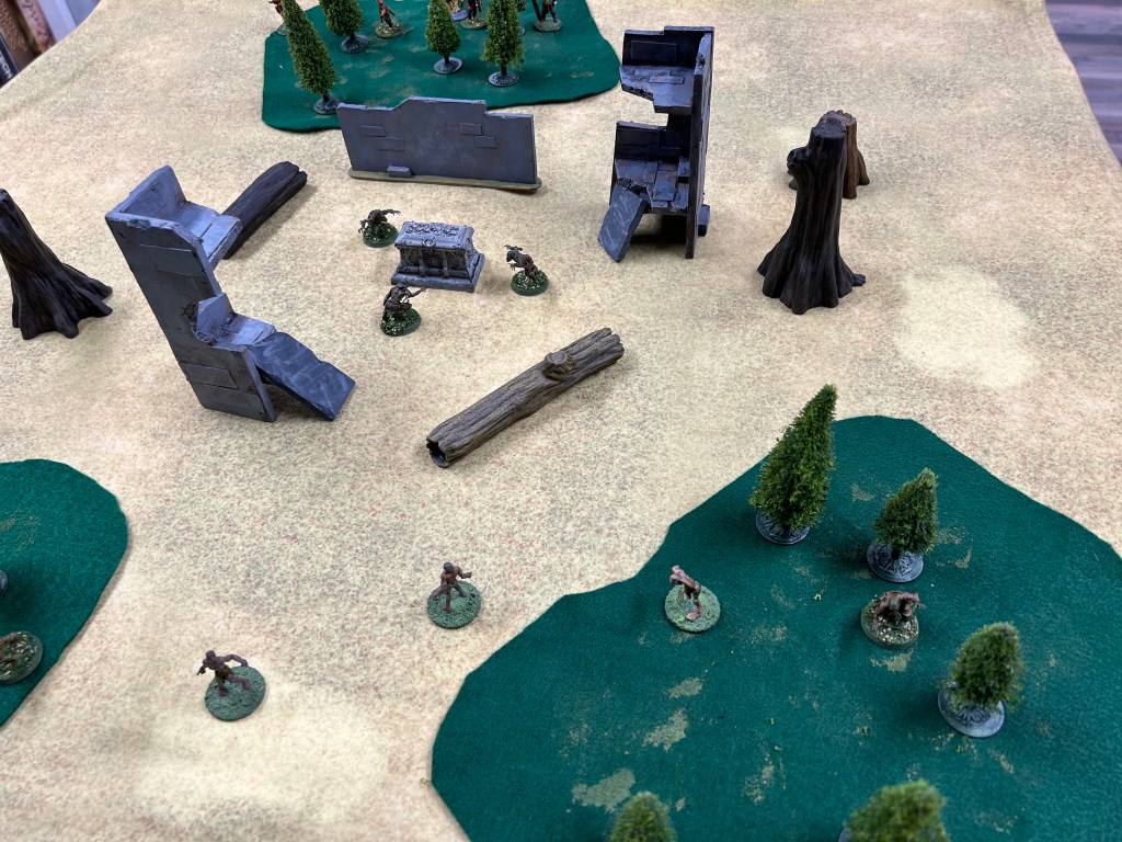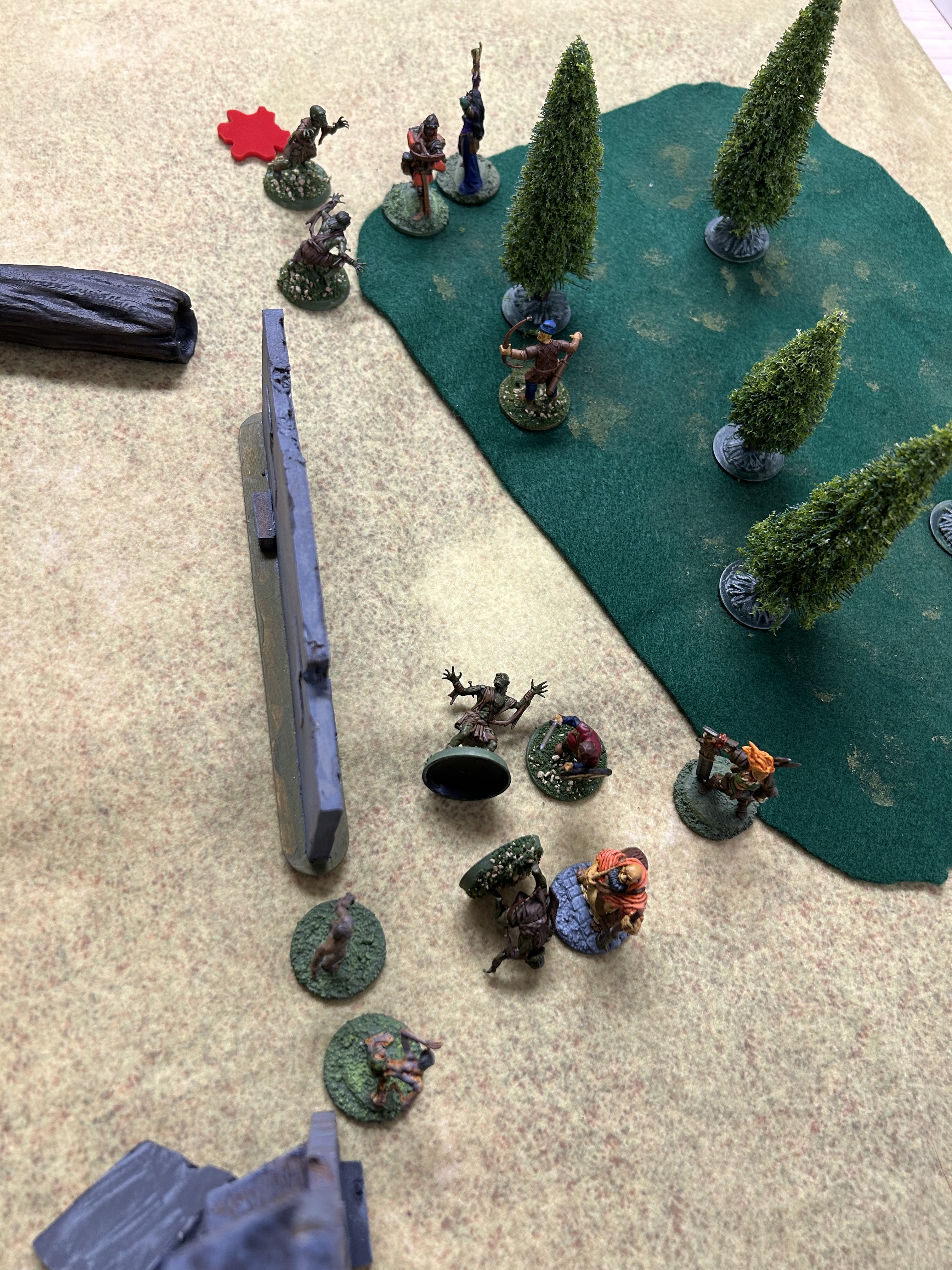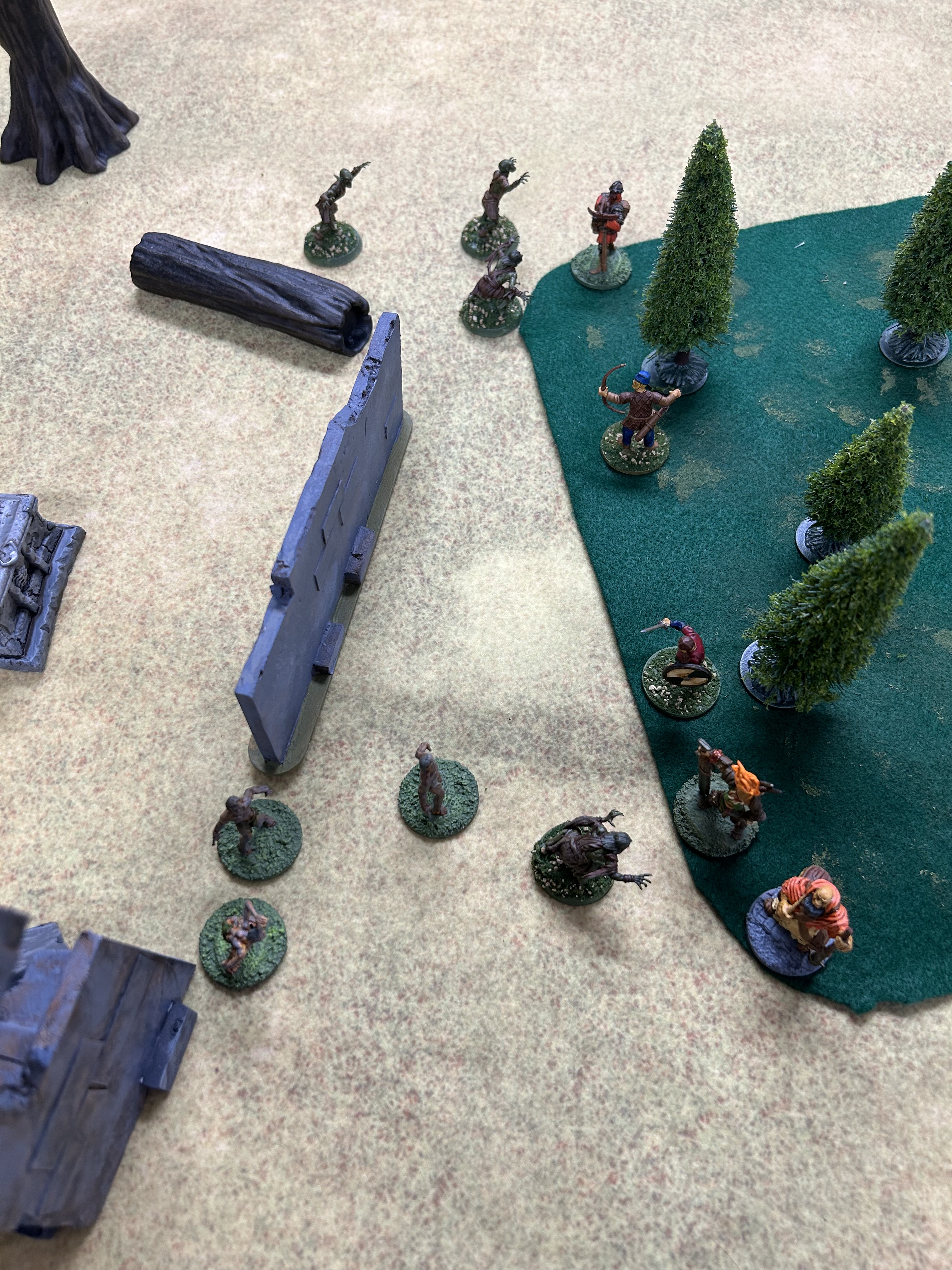 After several days of rest and small excursions to explore the area, the Torchbearers heard of a foul camp nearby that looked to be the jumping off point for raids from a warring enemy. As they crept towards the camp, it appeared to be an old ruined temple. Dark energies emanated from within and gibbering fiends, crazed with bloodlust, sat nearby. The humans seemed to have been driven mad, more animal than man. The Torchbearers worked their way to the edge of dense woods but a stick cracked under the foot of Zane, warning the raiders of intruders and they scrambled towards the party.