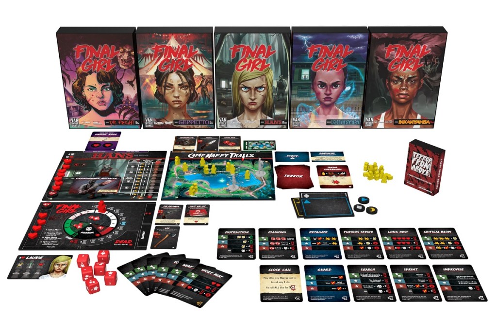 From Van Ryder Games, Final Girl is a solo board game that plays out your typical slasher horror movie. Pursued by a relentless killer, you try to save others, scramble to find weapons, and prepare for the eventual showdown against your murderous hunter. From my understanding the original game design was released as Hostage Negotiator, where you played a law enforcement agent trying to match wits against an unhinged criminal. The design was tweaked and updated to fit within the slasher flick theme and functions as a deck builder game with task resolution using dice. The overall objective is to win by killing the murderer before they kill you.