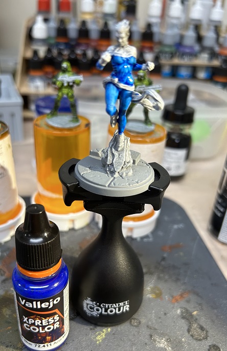 Last time I covered my approach to Iron Man, next up on my bench was Captain Marvel. This time I used a more typical approach to contrasts using a modified slop chop method. I found that the Vallejo Xpress contrasts are really vibrant paints. GW contrasts needs that black wash to bring out the shadowed depth of color. With the Vallejo Xpress paints I could just use a simple white drybrush over gray primed minis. For other colors I used Vallejo acrylic paints.