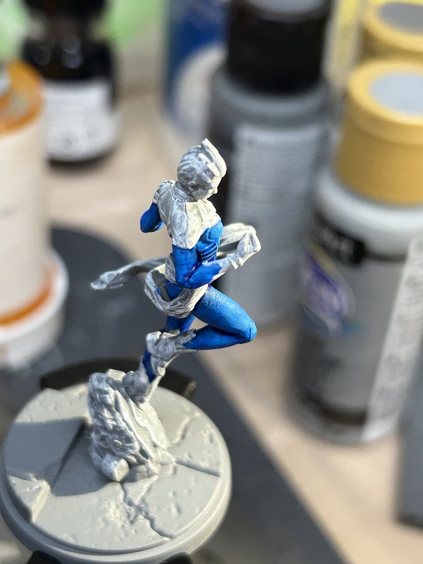 For much of her suit I used Xpress Mystic Blue which gave her a lovely deep blue base. Note on the hands I was going for a fiery color, so I gave her hands and some of her forearms a white base coat.