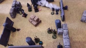 For the meat of the skirmish game itself, you play on a table somewhere between 2 to 3 feet square. A good amount of terrain will be needed to break up line of sight. You’ll have roughly 6 crew members matched against a random number of opponents (usually about 3-8). The game will have some manner of a win condition and is played over rounds.