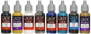 Inks are similar to washes, except the pigment is more intense. They are excellent if wanting to impart more color to your shading, particularly for brighter colors. Like with paint washes, you want to dilute out inks quite a bit as even diluted they can provide a lot of color. Glazes can be used for shading but work more for blending colors. Glazes are a great means to add subtle transitions of color like folds of cloth on a miniature. One thing about inks, you might end up getting a gloss shine to a figure. Don’t panic. If you are following through all the steps of miniature painting, using a matte varnish to seal the figure will cut down any glossiness from ink washes.