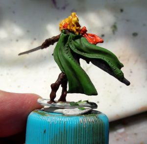 The cloak I am working with can be difficult as larger areas can be hard to apply effective highlights, unlike the sharp edges of the cloak and crisp folds. It’s a subtle technique (and likely may not photograph well with a crappy phone camera) but you can just make out some of the upper folds having a lighter tint. Obviously the lighter shade of color compared to the base coat, the more dramatic the effect.