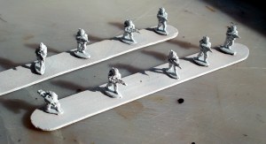 If working with smaller figures like 15mm ones. You can use popsicle sticks (bought at craft supply stores) and PVA, or white Elmer’s glue. The figures below are some examples where I’ve used wooden craft sticks to mount miniatures for painting.