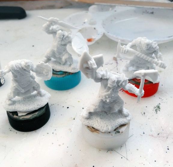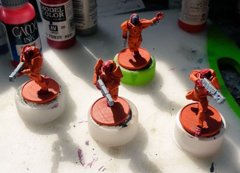 There are fancy miniature clamps that you can use, but I’m a fan of good old blu tack and soda bottle caps. Blu tack is a soft adhesive putty used for putting up posters onto walls and forms a temporary bond. I gather up old soda bottle caps and use them as a handle to plop figures on.