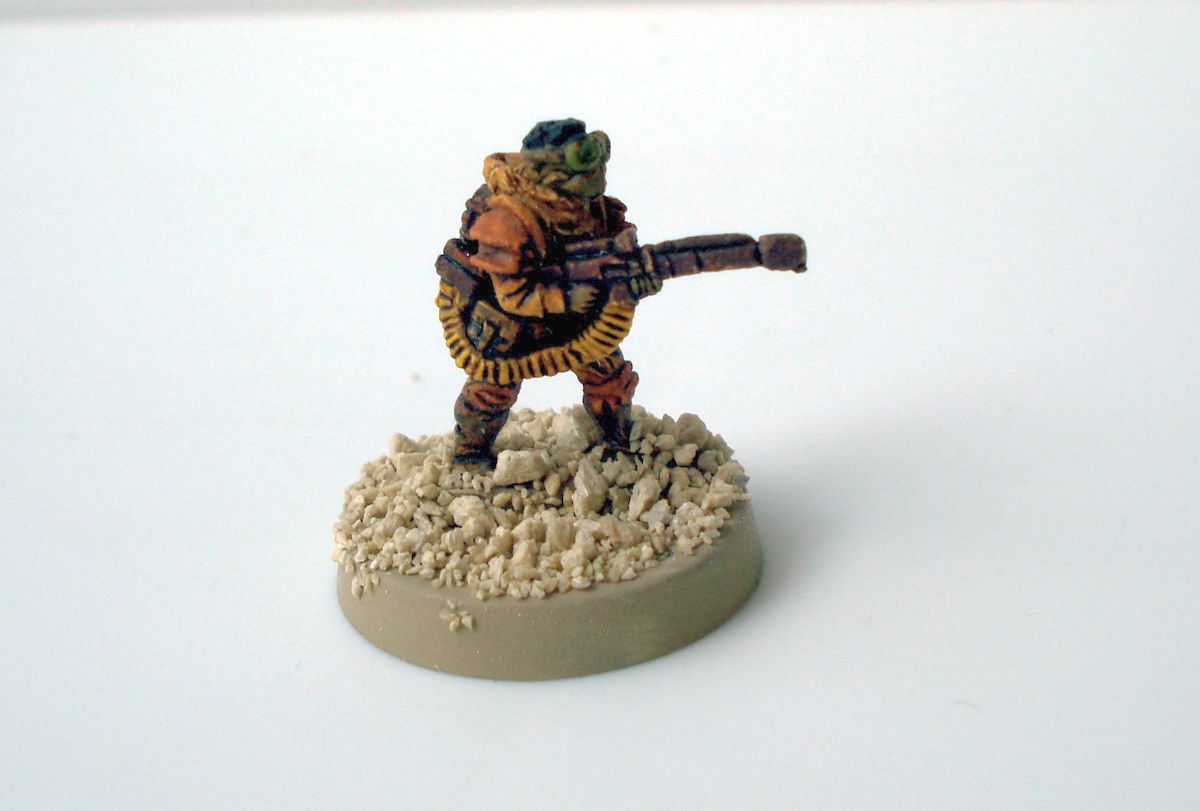 Rather than put a lot of time into drybrushing highlights, I ended up using high contrast highlighting. The trick is to pick a lighter hue paint color and just touch on the clothing and parts that would catch most of the light. So you end up painting the folds and not the creases of jackets and tunics, lighten the top shoulders, highlight pant material around bent knees, etc. It will look a little off putting with the stark contrast, but that’s the result you want.