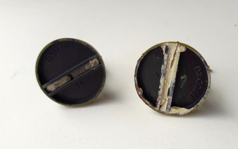 If you have a lot of open gaps like certain bases, you might want to invest in squadron or white putty. This is more a serious scale modelers tool. Like green stuff epoxy putty it can easily fill in gaps. Once dry it can be painted or sanded down. Some types are a little toxic to work with though. However if you’ve got a ton of gaps to fill in (like with these slotted miniature bases pictured below), it’s far easier to use squadron putty than green stuff.