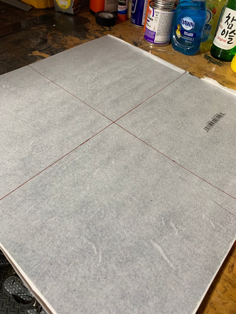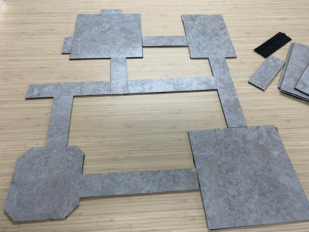 I cut the tiles, scoring them with a utility knife and breaking them apart. Pretty easy going. The trick was to figure out what size tiles. I ended up having most being oversized at 9×9 inch. I also made a few rectangle rooms. The bigger rooms will allow for more maneuvering and shifting around to accommodate the corridor sections.