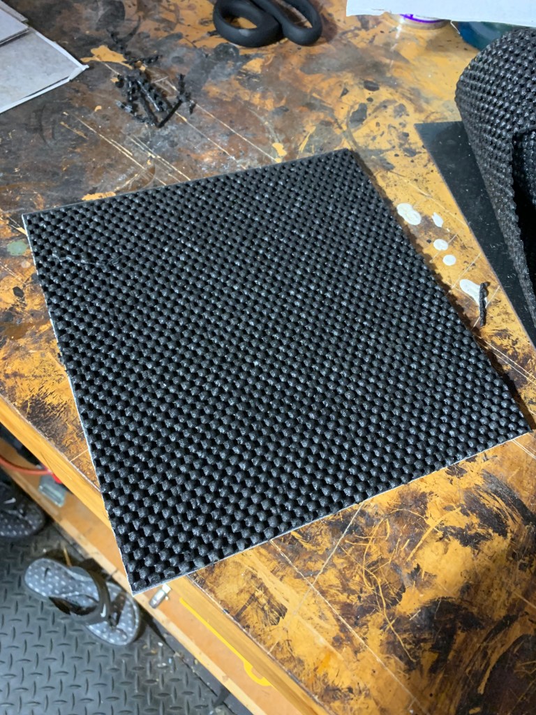 So I set about making up new tiles. I went down to the hardware store and picked up some laminate floor tiles on the cheap. I also bought some non-slip shelf liner to keep the tiles from skidding around. The tiles themselves had an adhesive backing, so it would be a snap to attach the shelf liner to the back.