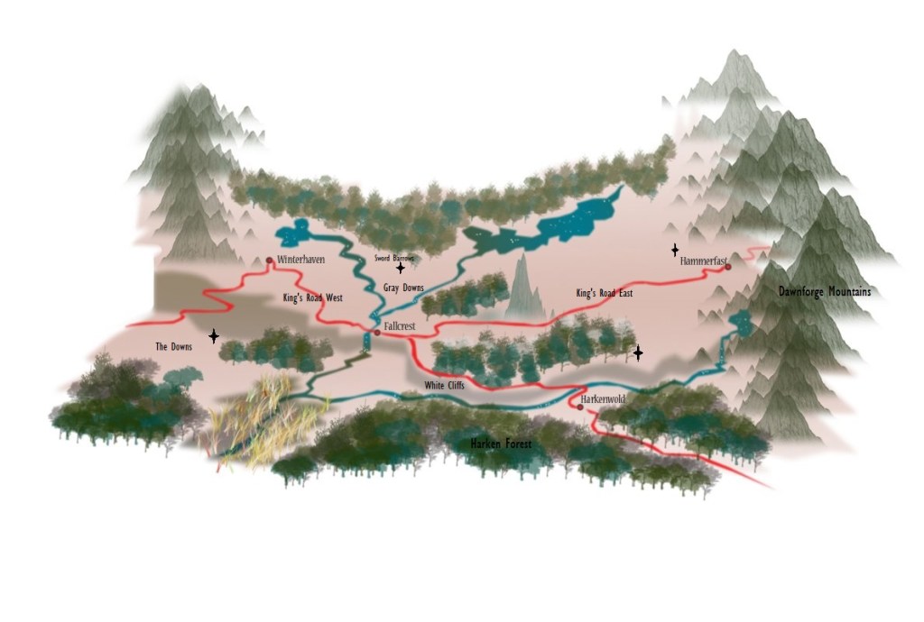 I’m going to leave much of it unlabeled for now and likely deviate from the proper Nentir Vale location names in the future. Luckily enough I rolled the perfect amount of starting settlements with 1 hamlet, 2 villages, and one town. The town serving with the market town characteristic will certainly be Fallcrest. Another village is also a market town, so I’m making that Hammerfast. The last village is supposed to be a small community that surrounds an extensive manor, which will be ideal for Harkenwold. The last settlement was determined to be a nomadic camp, which at first got me stumped some, but realized that Winterhaven would be a perfect name. I could completely see it being a camp that arises from wandering tribes on the periphery of the vale, seeking respite from the brutal winter season.
