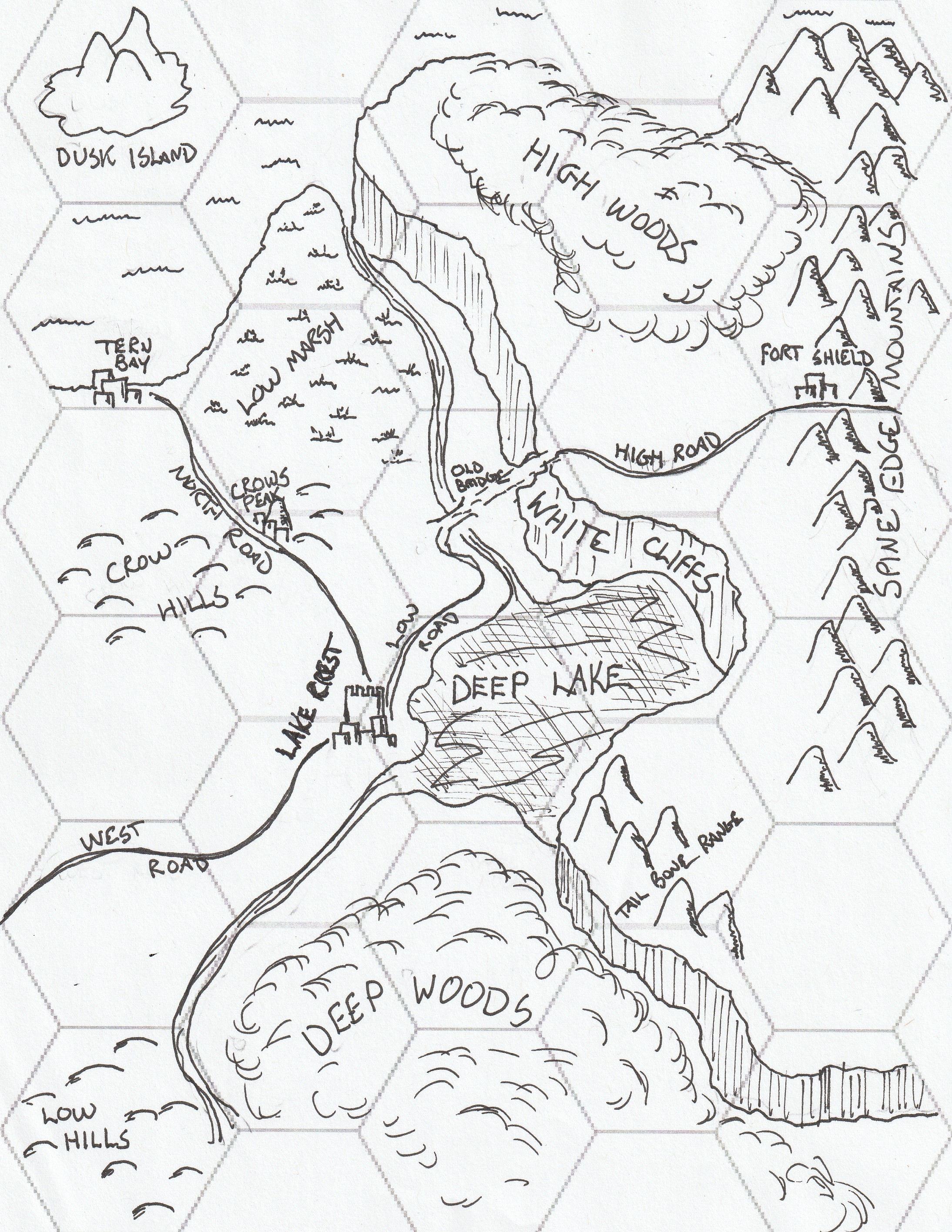 Given there was a coast, I had to have a small village on the shoreline as well as an expansive marsh. Not to mention an island nearby. I figured a fortified outpost along the mountain trail would be the best place for the hamlet. And a small village along the road connecting most of the communities would be a good spot. I also liked having a large chunk of the region cordoned off, so it is essentially split by the eastern portion up on an elevated range. The western section being more civilized lands having woods, rivers, and roads, all under a far-reaching series of cliffs that define the region.