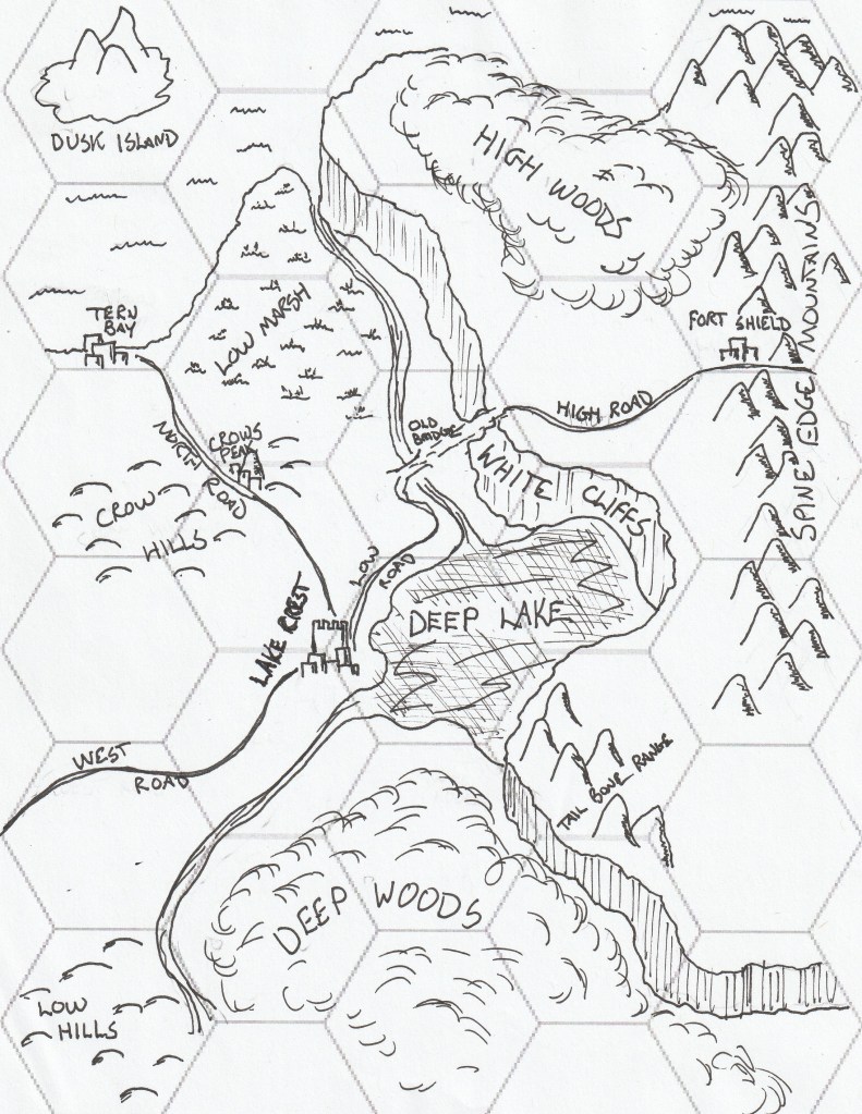 Rolling up settlements in the area, I ended up with a town, 2 villages, and a hamlet. All the more civilized villages were market towns, while the hamlet was a military outpost. I decided a town would be at the relative region center, bordering a deep lake, rivers running north and south, along with being the nexus of the region’s roads fitting for a trading hub. One border would be laced with an ominous mountain range, along with a coastal region to the north.