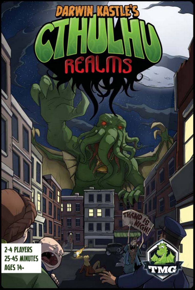 Tasty Minstrel Games offers Cthulhu Realms, a small deck building game for 2-4 players. This is a nod and a wink to Star Realms, which is another small deck builder game from a different company. Players are nefarious followers of Cthulhu trying to drive their opponents mad, inflicting damage to their sanity. It’s a game of player elimination where players try to reduce each of their opponent’s point total (sanity) to zero being the last cultist standing.
