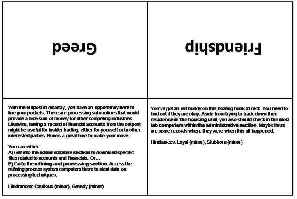 This method does tend to work for more structured one-shots or demos. I’ve run a survival horror, sci-fi game and another weird WW2 game where exploration and investigation was warranted. Having the motivation cards linked to particular areas really drove players to discuss with (and at times connive) each other into exploring a particular area. This helped push the characters into being proactive which is especially helpful for a timed demo game.