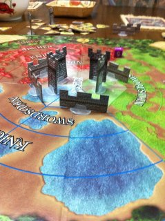 The game board has a series of concentric rings representing different range bands for specific cards (archers attack in the furthest, knights in the middle, and swordsmen in the innermost circle). Additionally the board is split into three different color sections. So a red archer can only attack the outer ring in the red section. Got a pesky goblin in the green section? Tough luck.