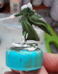 The cloak I am working with can be difficult as larger areas can be hard to apply effective highlights, unlike the sharp edges of the cloak and crisp folds. It’s a subtle technique (and likely may not photograph well with a crappy phone camera) but you can just make out some of the upper folds having a lighter tint. Obviously the lighter shade of color compared to the base coat, the more dramatic the effect.