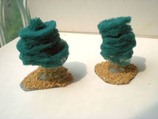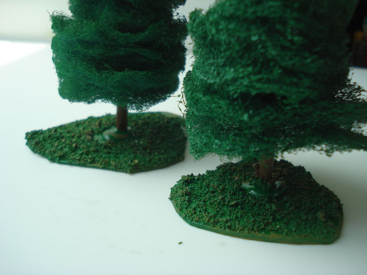 After letting them dry, I painted the trunks a nice brown coat, and followed it up by drybrushing the bases with a lighter green to simulate grass and low brush. More chunks of flock could be added if needed, but overall I liked the effect it gave.