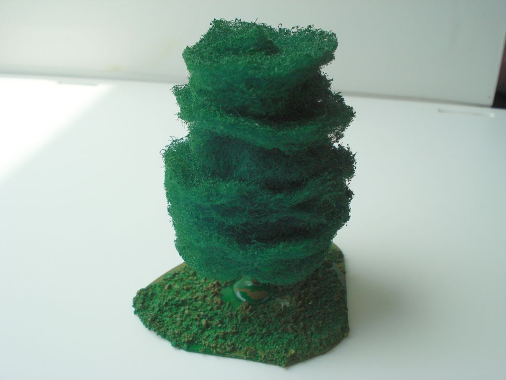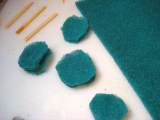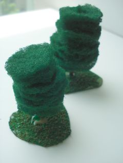 I cut the pads into rows and then in approximately 1 ½” to 2” squares. I then trimmed the square pads into rough circles. I made sure to save a lot of the small corner bits of pad after cutting the major sections into circles. Some of the pads I cut into smaller circles of about 1 inch to serve as the top section of the tree, and followed this up by cutting the tree ‘trunks’ into 3-5” lengths. I found while larger trees are more realistically scaled, they are almost too big for wargaming.