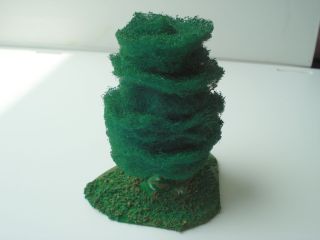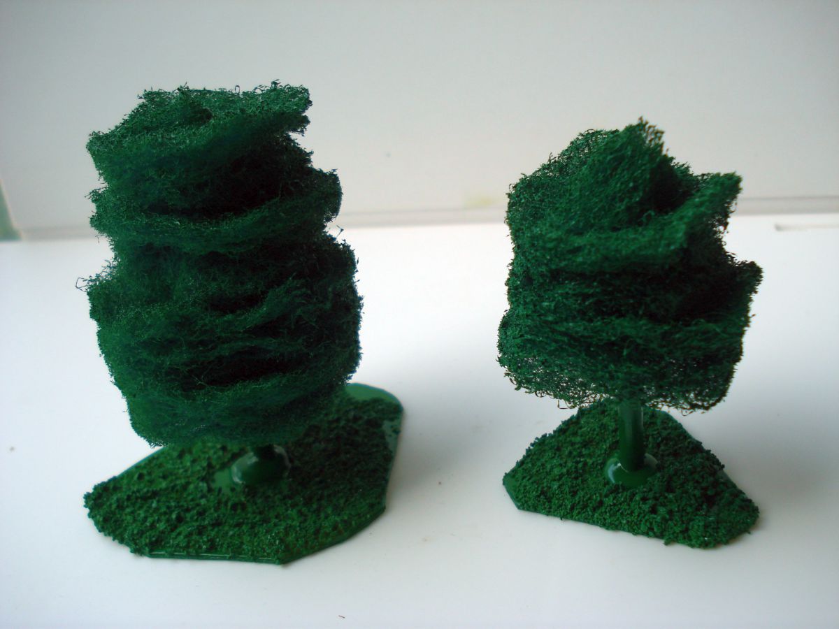 I put down a layer of watered-down PVA glue and after letting the model ballast dry, set to painting it. I gave each tree a good coat of green spray paint. A nice part of this is that the paint will also act as a sort of cement for the ballast, and stiffen up the pad sections of the tree too.