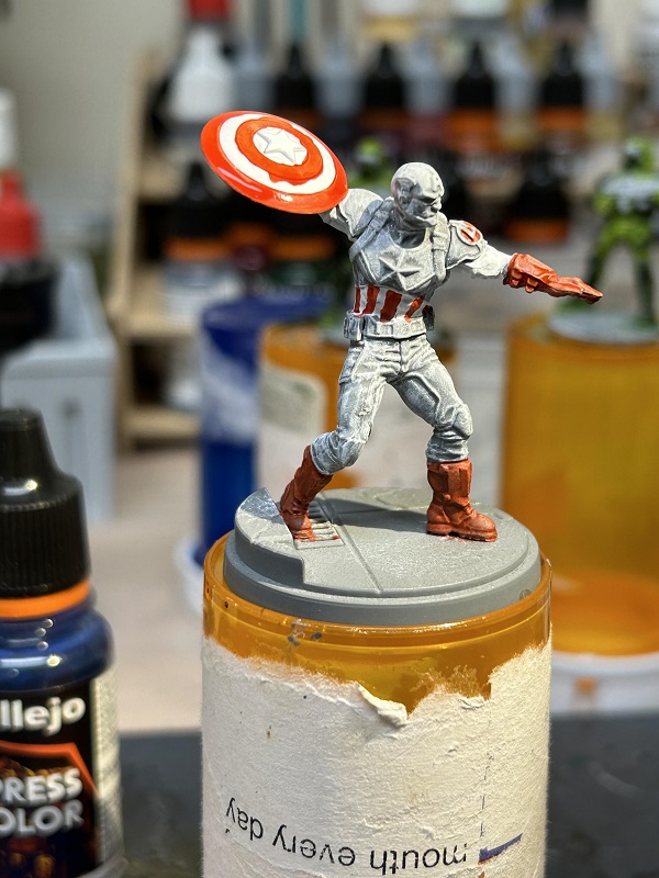 Last time I detailed my paint scheme for Captain Marvel. This time I’m going to go over the other Captain in the Marvel Crisis Protocol core set, Captain America. Like the other models I painted I primarily used Vallejo Xpress contrast paints (with Vallejo acrylics on other portions). A slightly different approach over your typical slop chop method, I painted a base coat of white over parts of the model. Cap’s waist, biceps, and outward section of the shield were all given a coat of white.