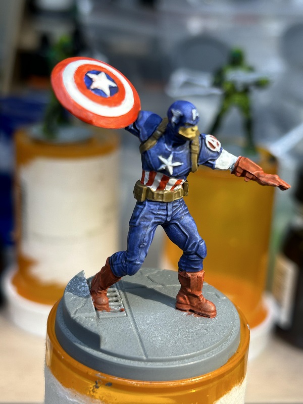For the center part of the shield and the rest of Captain America’s uniform, I used Xpress Storm Blue. Painting it unthinned, I think it really gave a wonderful look to the figure.