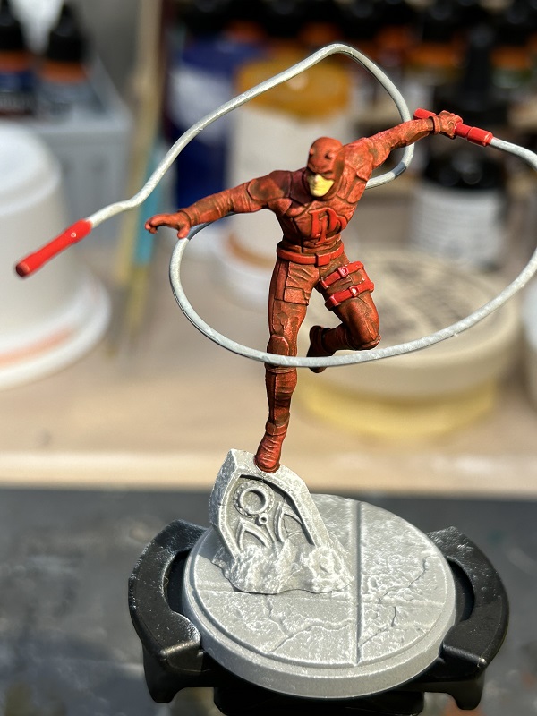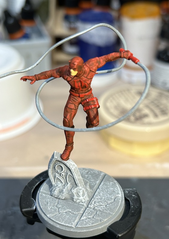 To make Daredevil’s chest symbol and baton webbing stand out more, I put down a coat of Vallejo Red. For his skin, I used a coat of Vallejo Dark Flesh.