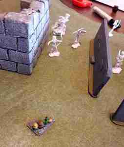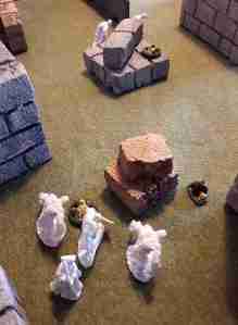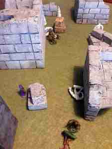 I managed to cut down the wolf and clear the area of enemies. My thug to hauled the treasure away while my thief, man-at-arms, and hound ran off to make trouble. My opponent ended up having their barbarian step onto a platform and ended up on my side of the field. My archers promptly perforated him. However my opponent was still working his men off the table with Leap and making good progress at it.