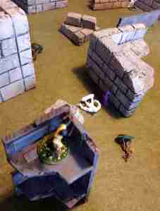 My fortune for getting Blinding Light on both casters was hampered some by the initiative. I acted second for the turn, meaning my opponent was able to get a wizard spell off and they were also able to get an opportunity to break its effects. I just was barely able to get the spell off and his necromancer dispelled it easily. His apprentice wasn’t so lucky. This was enough for him though and he decided to get his Necromancer scarce, but was successfully able to Leap his treasure burdened soldiers off the table with him.
