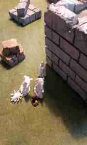 Honestly the game was pretty much a blur (and I forgot to take a lot of pics). We squared off with myself huddled behind a central ruined building. I wanted to push up through the middle and also along my left side, while my opponent had the same idea. And my opponent? Another Necromancer with some thugs, thieves, warhound, tracker, and a raging barbarian. He pretty much had the same idea and gameplan.