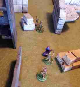 I finally turned my attention to his pesky archer that was throwing pop shots. A cast of Push and I was able to knock him off his ruined building perch. He didn’t take any damage but I effectively put him out of the fight a turn while he scrambled to get into a firing position. I then managed to land Blinding Light both on his wizard and apprentice.